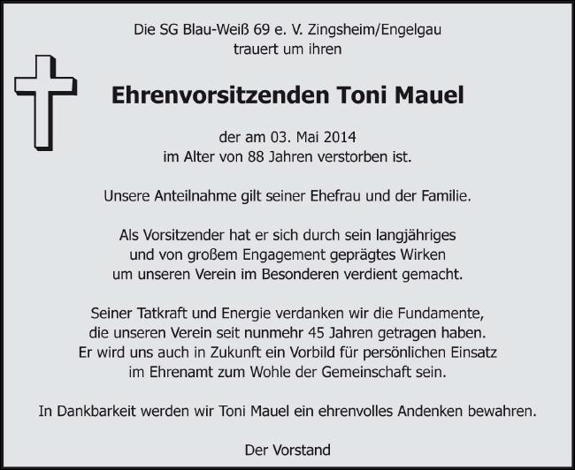 Die SG Blau-Weiß 69 e. V. Zingsheim/Engelgautrauert um ihrenEhrenvorsitzenden Toni Mauel